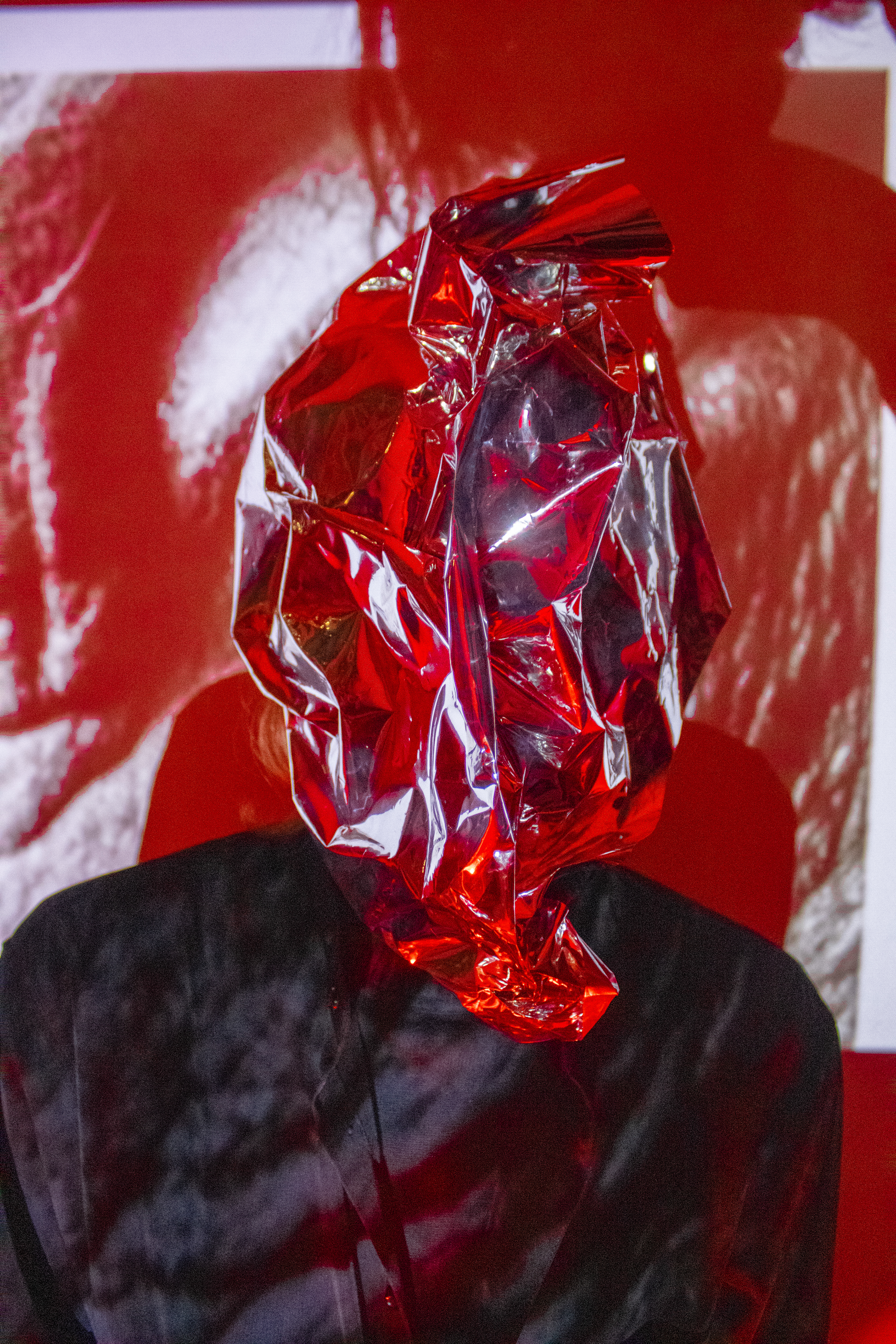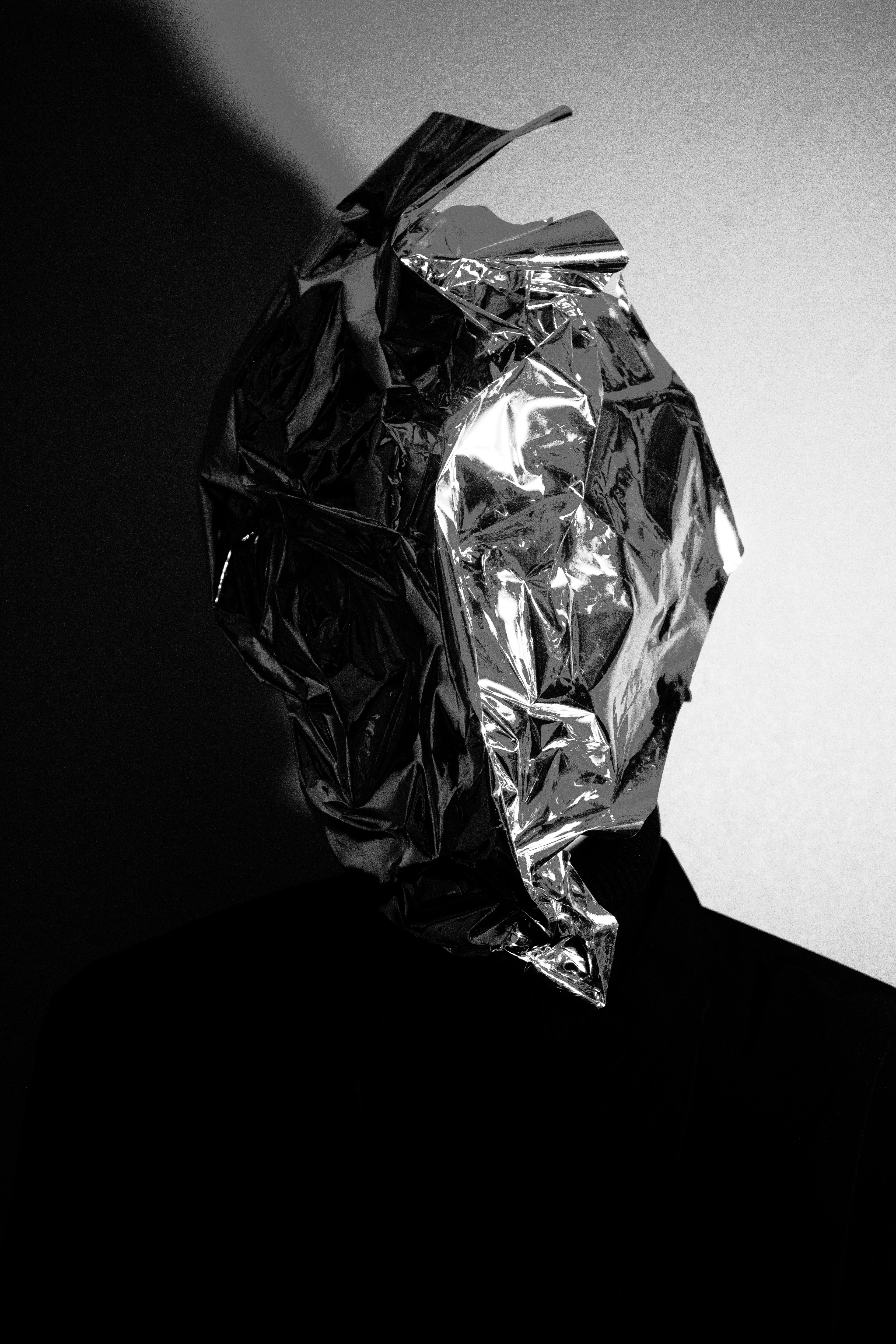 Les deux photographies présentent dans un premier temps le mystère qui vient se matérialiser sous la forme d’un miroir à l’état de substance. Celui-ci, vient se fondre avec le corps, jusqu’à faire disparaître le visage. Il s’agit là de l’essence de l’être et non de son apparence. La réduction de la palette chromatique vient appuyer la dualité de l’être, tiraillé par cette matière-affect qui vient s’encrer en lui par déformation. Le photogramme vient désigner mystère en tant qu’enveloppe temporelle métaphysique. Ici le temps n’est plus que matière fragmentée faisant à la fois apparaître et disparaître l’être.