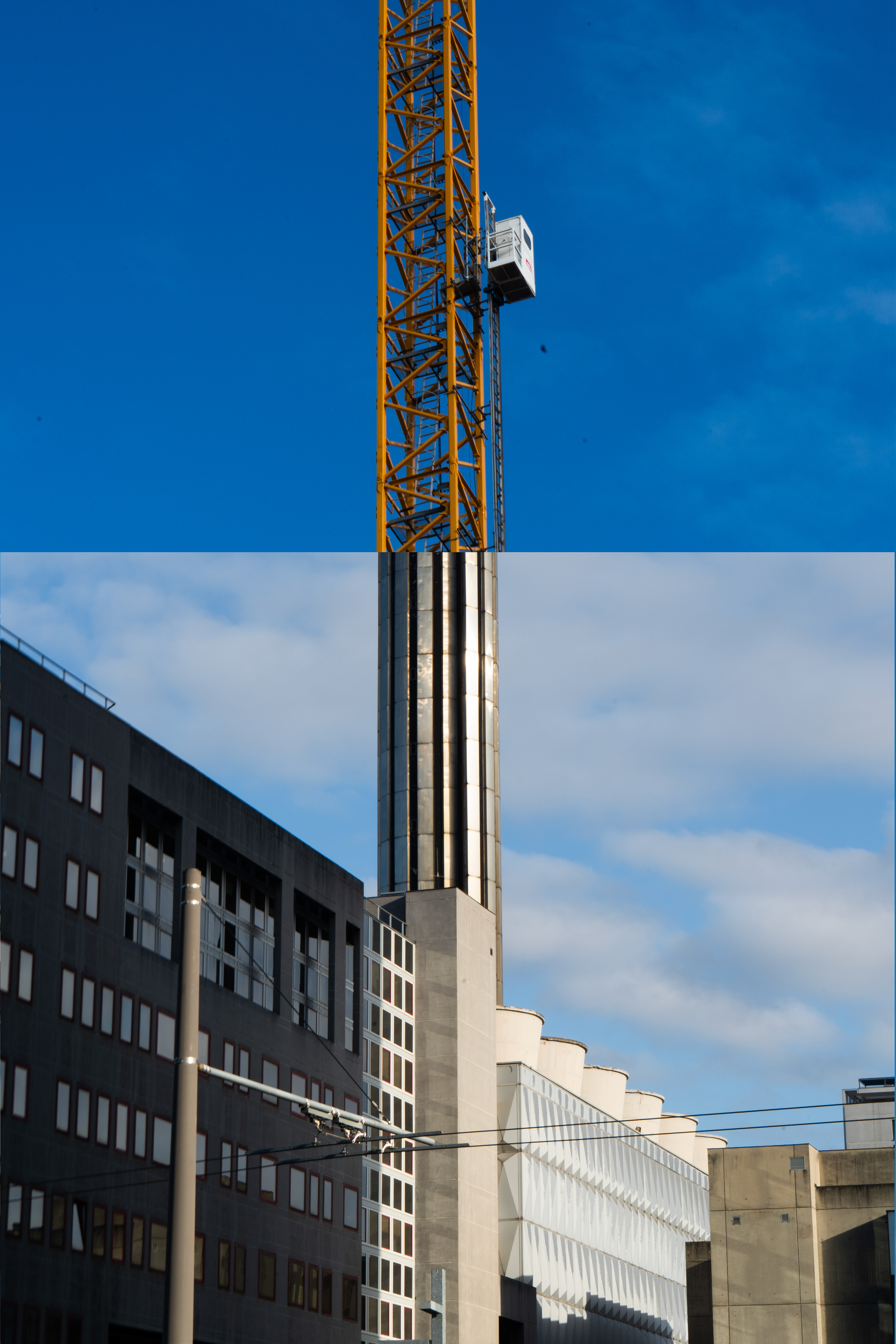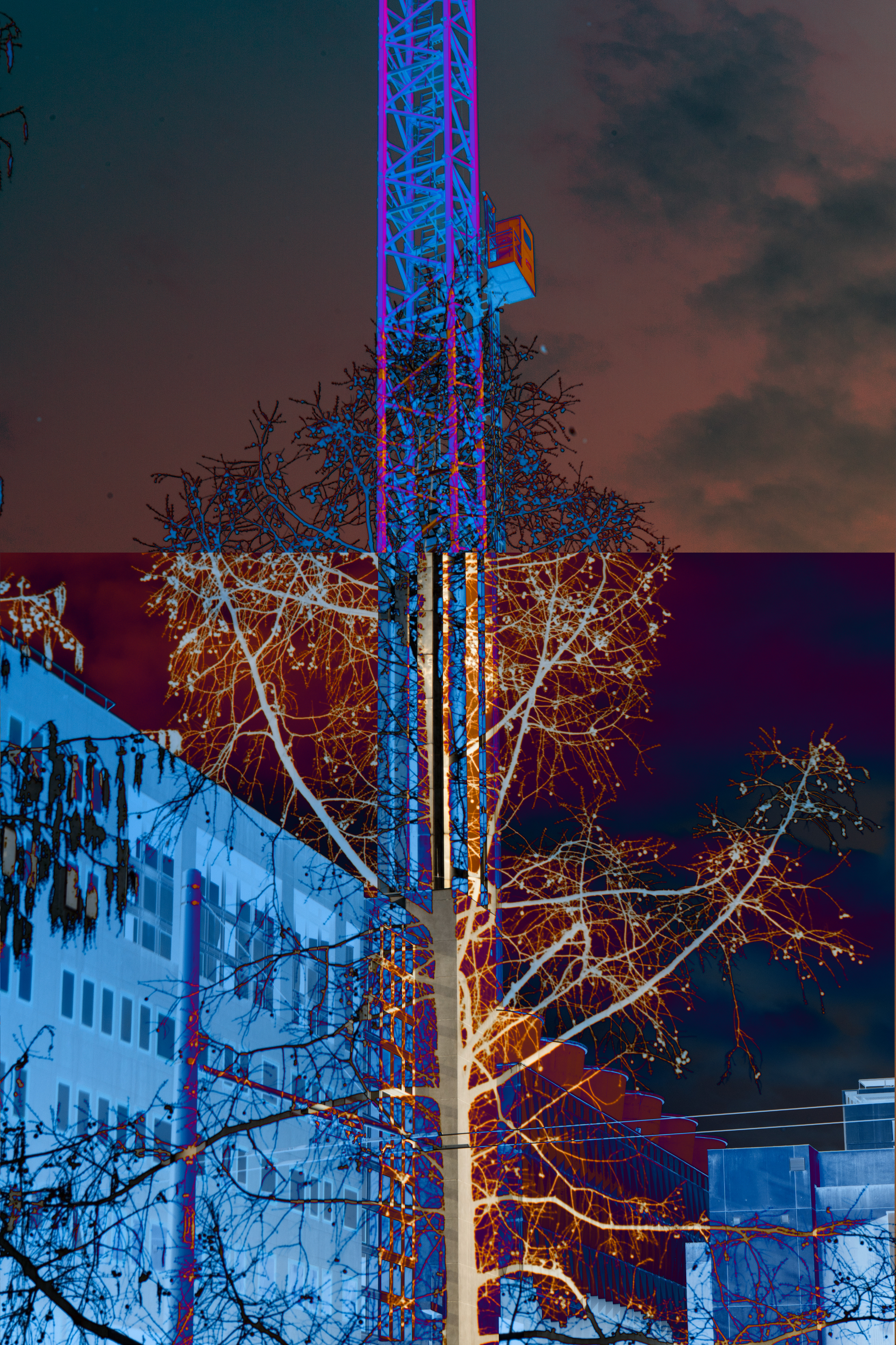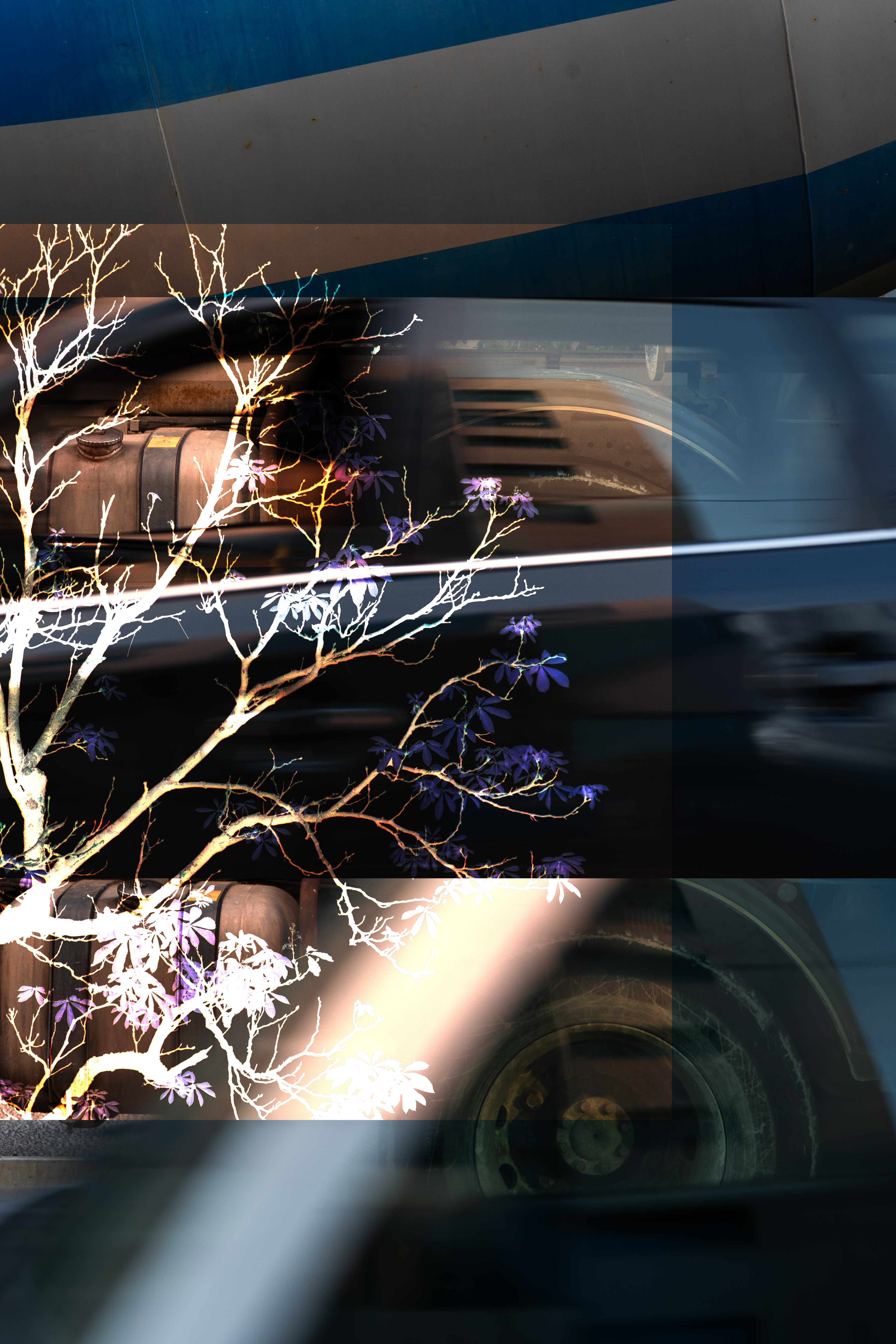 grues et cheminées deviennent troncs d'arbres, les voitures épousent le mouvement du